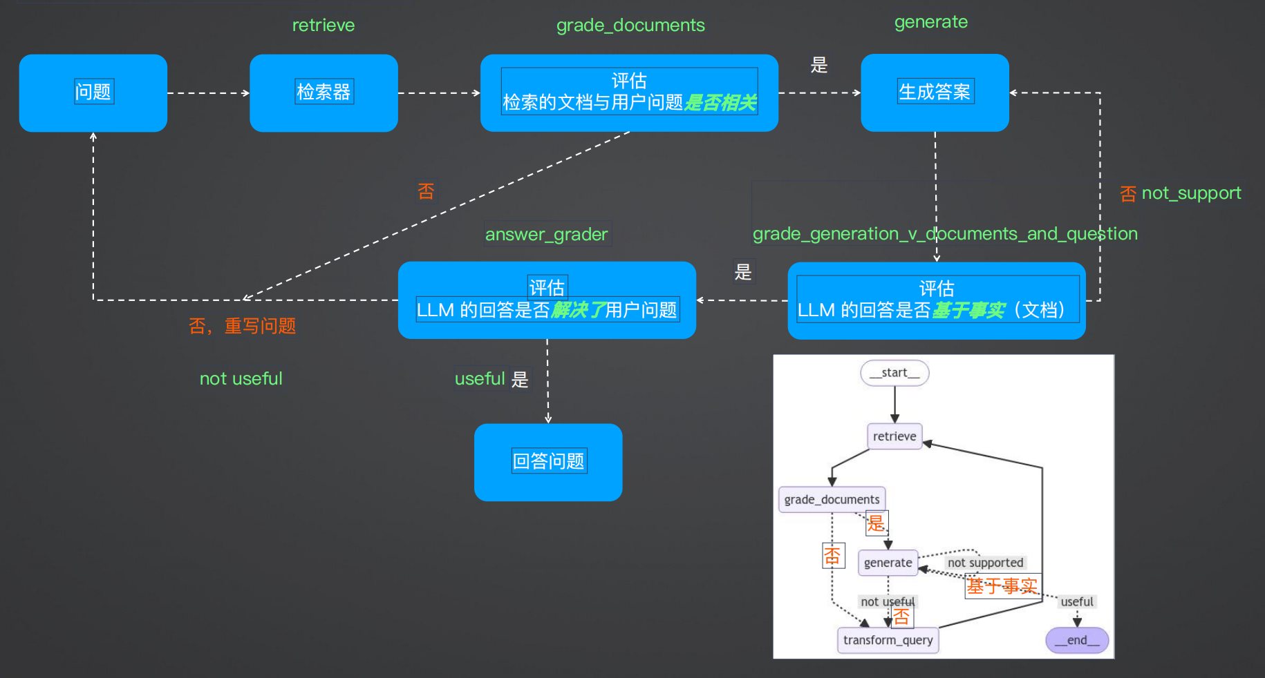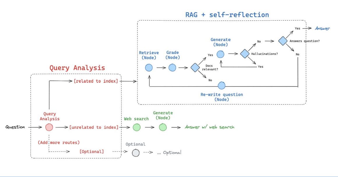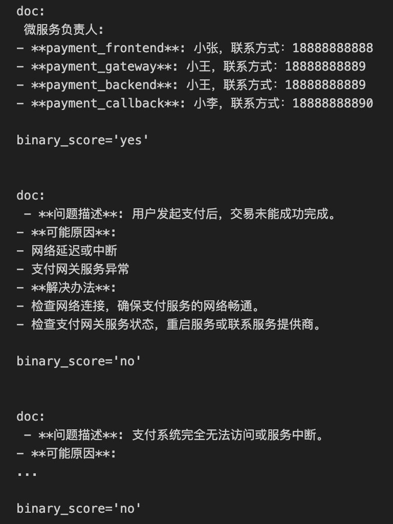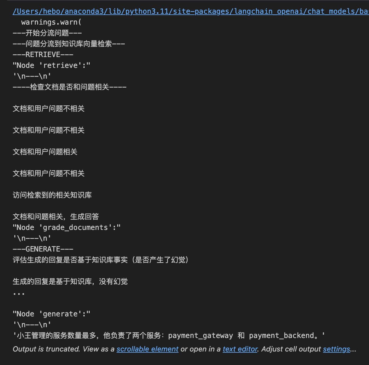LangGraph Tavily实现自适应RAGAgent 电脑版发表于:2025/9/15 17:23  >#LangGraph实现自适应RAGAgent [TOC] 原理 ------------ tn2>基于论文: https://arxiv.org/abs/2403.14403 <br/> 核心点: Web搜索工具:针对近期事件的搜索 自适应RAG工具:针对知识库相关问题 路由器:判断问题交由Web搜索还是RAG处理  tn2>这幅图讲述了它的执行过程: 1.用户先提出一个问题。 2.路由器判断问题是要查最新事件还是知识库。 3.如果是最新事件,就走 Web 搜索工具。 4.如果是知识库问题,就走自适应 RAG 工具。 5.系统最后把结果整理好输出给用户。 Web搜索:Tavily ------------  tn2>使用Tavily执行网络搜索,让LLM感知现实世界。 ### 特点 tn2>快速响应:相比较搜索引擎能更快返回结果 良好摘要:无需加载页面的所有内容 结果优化:针对LLM优化的搜索结果,提高准确率 SaaS服务,需申请Key: https://app.tavily.com  tn2>这里我们创建AIOps的key,然后我们创建一个文件夹并创建一个`tavily.ipynb`文件,然后安装相关依赖包。 ```bash ! pip install -U langgraph langchain-openai tavily-python langchain-community ```  tn2>下面在这段代码里,我主要是用 LangChain + LangGraph 搭建了一个最简单的智能体工作流。 核心思路是:先定义一个基于 GPT-4o 的模型,并给它绑定了 Tavily 搜索工具。然后通过一个路由函数来判断:如果模型生成的消息里包含工具调用,就跳转到工具节点执行,否则直接结束。整个流程被抽象成了一个 有条件的状态图(StateGraph),其中节点之间的关系用 add_node 和 add_edge 来描述。最后我把这个工作流编译运行,不仅可以流式输出查询结果(例如“2024 年深圳程序员平均薪酬”),还能绘制出整个流程图,直观地展示智能体在运行时的结构和逻辑。 ```python import os from langchain_openai import ChatOpenAI from typing import Literal from langchain_core.tools import tool from IPython.display import Image, display from langgraph.prebuilt import ToolNode from langgraph.graph import StateGraph, MessagesState from langchain_community.tools.tavily_search import TavilySearchResults os.environ["LANGCHAIN_TRACING_V2"] = "true" os.environ["LANGCHAIN_ENDPOINT"] = "https://api.smith.langchain.com" os.environ["LANGCHAIN_API_KEY"] = "你的Langchain的Key" # LangSmith 项目名称,默认 default os.environ["LANGCHAIN_PROJECT"] = "default" # Tavily API Key os.environ["TAVILY_API_KEY"] = "你的Tavily Key" def call_model(state: MessagesState): messages = state["messages"] response = model_with_tools.invoke(messages) return {"messages": [response]} def should_continue(state: MessagesState) -> Literal["tools", "__end__"]: messages = state["messages"] last_message = messages[-1] if last_message.tool_calls: return "tools" return "__end__" tools = [TavilySearchResults(max_results=1)] model_with_tools = ChatOpenAI(model="gpt-4o", temperature=0, api_key="你的OpenAPI Key" ).bind_tools(tools) tool_node = ToolNode(tools) workflow = StateGraph(MessagesState) workflow.add_node("agent", call_model) workflow.add_node("tools", tool_node) workflow.add_edge("__start__", "agent") workflow.add_conditional_edges( "agent", should_continue, ) workflow.add_edge("tools", "agent") app = workflow.compile() try: display(Image(app.get_graph().draw_mermaid_png())) except Exception: pass for chunk in app.stream( {"messages": [("human", "2024年深圳程序员平均薪酬")]}, stream_mode="values" ): chunk["messages"][-1].pretty_print() ```  自适应RAG ------------ tn2>基于论文: https://arxiv.org/abs/2310.11511 特点: ?对检索到的文档和生成的回答进行反思和评分,直到获得满意的回答 ?解决传统RAG粗暴检索固定数量段落以及回复准确性差的问题 ?显著提升长文本检索的准确性  ### 自适应RAG流程  ## 流程梳理 tn2>1.评估检索到的文档与用户问题是否相关 2.评估 LLM 回答的问题是否基于事实(检索到的文档) 3.评估 LLM 的回答是否解决了用户提出的问题 4.基于检索到的文档和用户问题,对用户问题进行优化  tn2>首先安装我们的包。 ```bash ! pip install -U langchain_community tiktoken langchain-openai langchainhub chromadb langchain langgraph ```  tn2>首先我们通过如下代码设置环境变量来配置 LangSmith 的追踪功能、接口地址、API Key 以及项目名称。 ```python import os from langchain_openai import ChatOpenAI os.environ["LANGCHAIN_TRACING_V2"] = "true" os.environ["LANGCHAIN_ENDPOINT"] = "https://api.smith.langchain.com" os.environ["LANGCHAIN_API_KEY"] = "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" # LangSmith 项目名称,默认 default os.environ["LANGCHAIN_PROJECT"] = "default" ``` tn2>然后我们将我们的一个`data.md`的文件放到`data`目录下面,按标题层级切分成小块后,用 OpenAI 向量模型生成向量,并存入 Chroma 向量数据库,最终构建出一个可用于检索的 retriever。 ```python from langchain_community.vectorstores import Chroma from langchain_openai import OpenAIEmbeddings from langchain.text_splitter import MarkdownHeaderTextSplitter import uuid file_path = os.path.join('data', 'data.md') with open(file_path, 'r', encoding='utf-8') as file: docs_string = file.read() # Split the document into chunks base on markdown headers. headers_to_split_on = [ ("#", "Header 1"), ("##", "Header 2"), ("###", "Header 3"), ] text_splitter = MarkdownHeaderTextSplitter(headers_to_split_on=headers_to_split_on) doc_splits = text_splitter.split_text(docs_string) # Add to vectorDB random_directory = "./" + str(uuid.uuid4()) embedding = OpenAIEmbeddings(model="text-embedding-3-small", openai_api_key="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" ) vectorstore = Chroma.from_documents(documents=doc_splits, embedding=emb