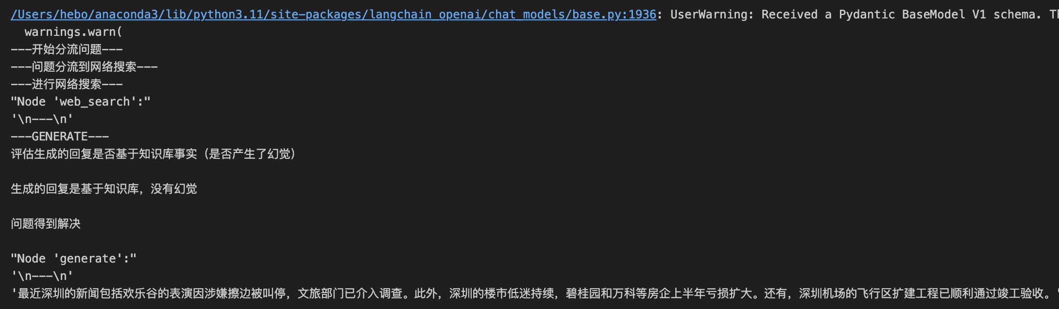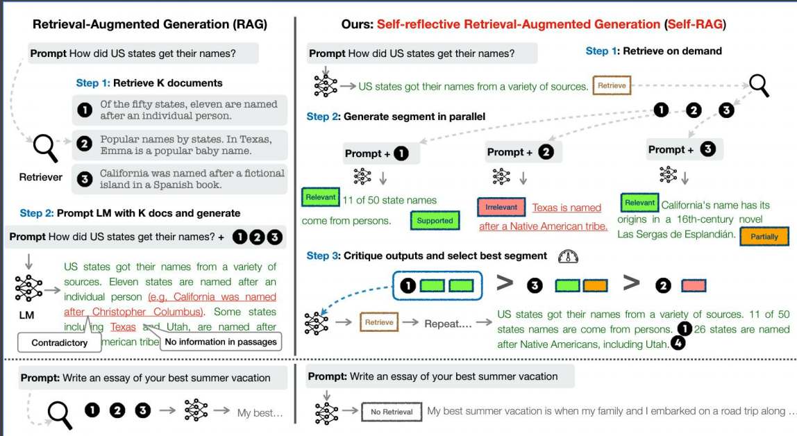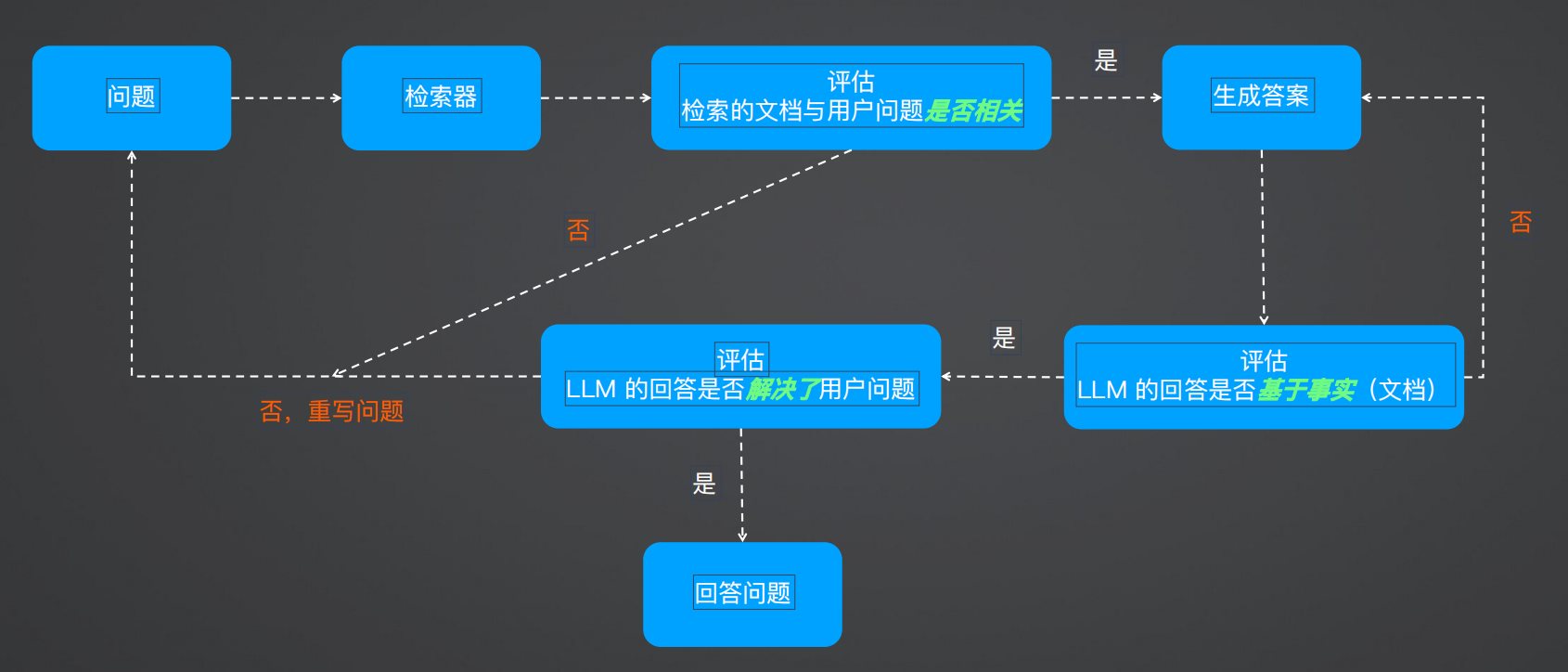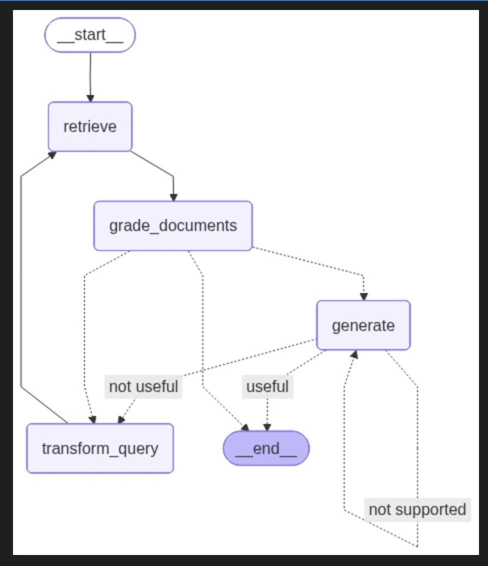 LangGraph Tavily实现自适应RAGAgent 电脑版发表于:2025/9/15 17:23  >#LangGraph实现自适应RAGAgent [TOC] 原理 ------------ tn2>基于论文: https://arxiv.org/abs/2403.14403 <br/> 核心点: Web搜索工具:针对近期事件的搜索 自适应RAG工具:针对知识库相关问题 路由器:判断问题交由Web搜索还是RAG处理  tn2>这幅图讲述了它的执行过程: 1.用户先提出一个问题。 2.路由器判断问题是要查最新事件还是知识库。 3.如果是最新事件,就走 Web 搜索工具。 4.如果是知识库问题,就走自适应 RAG 工具。 5.系统最后把结果整理好输出给用户。 Web搜索:Tavily ------------  tn2>使用Tavily执行网络搜索,让LLM感知现实世界。 ### 特点 tn2>快速响应:相比较搜索引擎能更快返回结果 良好摘要:无需加载页面的所有内容 结果优化:针对LLM优化的搜索结果,提高准确率 SaaS服务,需申请Key: https://app.tavily.com  tn2>这里我们创建AIOps的key,然后我们创建一个文件夹并创建一个`tavily.ipynb`文件,然后安装相关依赖包。 ```bash ! pip install -U langgraph langchain-openai tavily-python langchain-community ```  tn2>下面在这段代码里,我主要是用 LangChain + LangGraph 搭建了一个最简单的智能体工作流。 核心思路是:先定义一个基于 GPT-4o 的模型,并给它绑定了 Tavily 搜索工具。然后通过一个路由函数来判断:如果模型生成的消息里包含工具调用,就跳转到工具节点执行,否则直接结束。整个流程被抽象成了一个 有条件的状态图(StateGraph),其中节点之间的关系用 add_node 和 add_edge 来描述。最后我把这个工作流编译运行,不仅可以流式输出查询结果(例如“2024 年深圳程序员平均薪酬”),还能绘制出整个流程图,直观地展示智能体在运行时的结构和逻辑。 ```python import os from langchain_openai import ChatOpenAI from typing import Literal from langchain_core.tools import tool from IPython.display import Image, display from langgraph.prebuilt import ToolNode from langgraph.graph import StateGraph, MessagesState from langchain_community.tools.tavily_search import TavilySearchResults os.environ["LANGCHAIN_TRACING_V2"] = "true" os.environ["LANGCHAIN_ENDPOINT"] = "https://api.smith.langchain.com" os.environ["LANGCHAIN_API_KEY"] = "你的Langchain的Key" # LangSmith 项目名称,默认 default os.environ["LANGCHAIN_PROJECT"] = "default" # Tavily API Key os.environ["TAVILY_API_KEY"] = "你的Tavily Key" def call_model(state: MessagesState): messages = state["messages"] response = model_with_tools.invoke(messages) return {"messages": [response]} def should_continue(state: MessagesState) -> Literal["tools", "__end__"]: messages = state["messages"] last_message = messages[-1] if last_message.tool_calls: return "tools" return "__end__" tools = [TavilySearchResults(max_results=1)] model_with_tools = ChatOpenAI(model="gpt-4o", temperature=0, api_key="你的OpenAPI Key" ).bind_tools(tools) tool_node = ToolNode(tools) workflow = StateGraph(MessagesState) workflow.add_node("agent", call_model) workflow.add_node("tools", tool_node) workflow.add_edge("__start__", "agent") workflow.add_conditional_edges( "agent", should_continue, ) workflow.add_edge("tools", "agent") app = workflow.compile() try: display(Image(app.get_graph().draw_mermaid_png())) except Exception: pass for chunk in app.stream( {"messages": [("human", "2024年深圳程序员平均薪酬")]}, stream_mode="values" ): chunk["messages"][-1].pretty_print() ```  自适应RAG ------------ tn2>基于论文: https://arxiv.org/abs/2310.11511 特点: ?对检索到的文档和生成的回答进行反思和评分,直到获得满意的回答 ?解决传统RAG粗暴检索固定数量段落以及回复准确性差的问题 ?显著提升长文本检索的准确性  ### 自适应RAG流程  ## 流程梳理 tn2>1.评估检索到的文档与用户问题是否相关 2.评估 LLM 回答的问题是否基于事实(检索到的文档) 3.评估 LLM 的回答是否解决了用户提出的问题 4.基于检索到的文档和用户问题,对用户问题进行优化  tn2>首先安装我们的包。 ```bash ! pip install -U langchain_community tiktoken langchain-openai langchainhub chromadb langchain langgraph ```  tn2>首先我们通过如下代码设置环境变量来配置 LangSmith 的追踪功能、接口地址、API Key 以及项目名称。 ```python import os from langchain_openai import ChatOpenAI os.environ["LANGCHAIN_TRACING_V2"] = "true" os.environ["LANGCHAIN_ENDPOINT"] = "https://api.smith.langchain.com" os.environ["LANGCHAIN_API_KEY"] = "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" # LangSmith 项目名称,默认 default os.environ["LANGCHAIN_PROJECT"] = "default" ``` tn2>然后我们将我们的一个`data.md`的文件放到`data`目录下面,按标题层级切分成小块后,用 OpenAI 向量模型生成向量,并存入 Chroma 向量数据库,最终构建出一个可用于检索的 retriever。 ```python from langchain_community.vectorstores import Chroma from langchain_openai import OpenAIEmbeddings from langchain.text_splitter import MarkdownHeaderTextSplitter import uuid file_path = os.path.join('data', 'data.md') with open(file_path, 'r', encoding='utf-8') as file: docs_string = file.read() # Split the document into chunks base on markdown headers. headers_to_split_on = [ ("#", "Header 1"), ("##", "Header 2"), ("###", "Header 3"), ] text_splitter = MarkdownHeaderTextSplitter(headers_to_split_on=headers_to_split_on) doc_splits = text_splitter.split_text(docs_string) # Add to vectorDB random_directory = "./" + str(uuid.uuid4()) embedding = OpenAIEmbeddings(model="text-embedding-3-small", openai_api_key="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" ) vectorstore = Chroma.from_documents(documents=doc_splits, embedding=emb